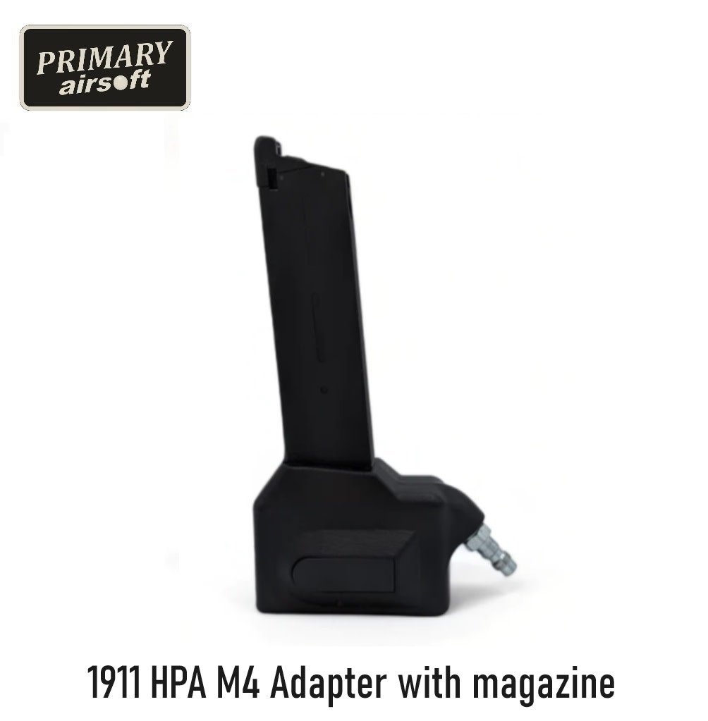 This is a custom designed laser sintered nylon adapter that allows you to use HPA (high pressure air) and M4 AEG magazines on your 1911 airsoft pistol. To use it you will also need an M4 AEG magazine, “paintball” tank with low pressure regulator (0-140) psi, a hose with a Foster (polarstar) quick disconnect and of course bbs. The normal operating pressure for green gas is roughly 120 psi depending on the temperature. We recommend that you run you pistol near this pressure and do not exceed 140 psi. Keep in mind that higher pressures can cause excessive wear and damage to the internal components of your airsoft pistol.